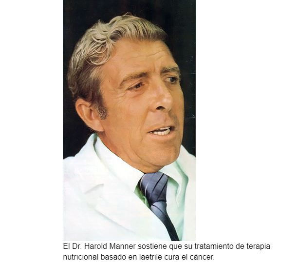 El Dr. Harold W. Manner, profesor de Biología y presidente del Departamento de Biología de la Universidad Loyola de Chicago, sostiene que su tratamiento basado en investigaciones que se basa en una controvertida teoría de la terapia nutricional puede contener, prevenir y curar el cáncer con laetrile.